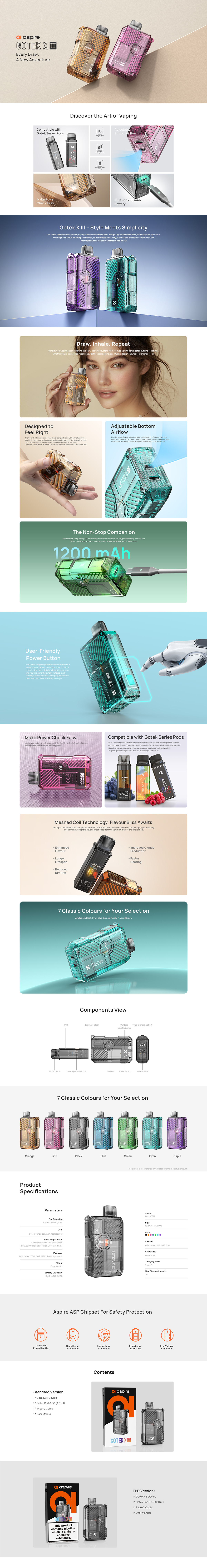 Το νέο GoTek X 3 της Aspire μας παρουσιάζετε στην συνέχεια της σειράς GoTek! Το GoTek X 3 είναι σχεδιασμένο για να προσφέρει μια ομαλή και αποδοτική εμπειρία ατμίσματος. Διαθέτει ισχυρή αναβαθμισμένη ενσωματωμένη μπαταρία των 1200 mAh, η οποία φορτίζει γρήγορα ώστε να ελαχιστοποιείται ο χρόνος εκτός λειτουργίας μέσο της θύρας USB Type-C που είναι εξοπλισμένο. Η ευκρινής LCD οθόνη μας παρουσιάζει ξεκάθαρα την κατάσταση της συσκευής σε πραγματικό χρόνο. Μας κρατά συνεχώς ενήμερους με άμεσες ειδοποιήσεις για τις συνθήκες λειτουργίας της ,την ένδειξη της μπαταρίας και το επίπεδο ενέργειάς της. Το ευαίσθητο σύστημα με αυτόματη ενεργοποίηση με την εισπνοή (auto-draw) εξασφαλίζει άμεση ενεργοποίηση, προσφέροντας απολαυστικό άτμισμα τύπου Mouth-to-Lung (MTL) ή Restricted-Direct-to-Lung (RDTL), ανάλογα με τις προτιμήσεις σας. Το GoTek X 3 είναι απολυτά συμβατό με τα GoTek Pod Mesh Coil! Τέλος ο εργονομικός και ελαφρύς σχεδιασμός του το καθιστούν τον καθημερινό διακριτικό σας φίλο!