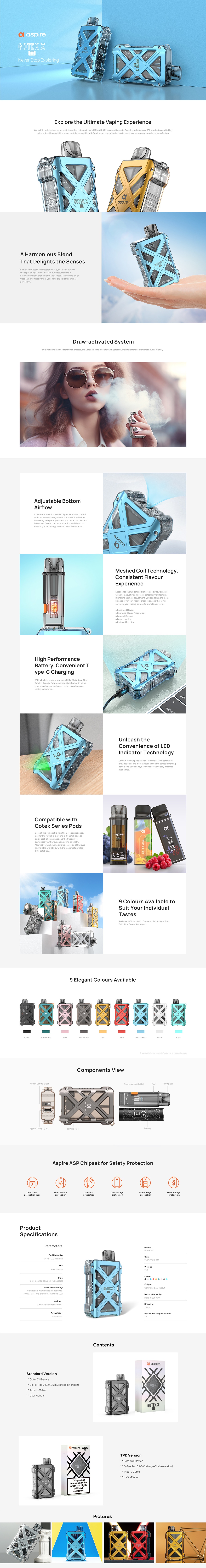 Καλωσορίζουμε το GoTek X2 της Aspire με τις νέες και βελτιωμένες αναβαθμίσεις από το τον προκάτοχό του GoTek X. Με μια αναβαθμισμένη ενσωματωμένη μπαταρία των 800 mAh, εξασφαλίζει ότι θα διαρκέσει όλη την ημέρα ενώ με την δυνατότητα γρήγορης φόρτισης μέσο θύρας Type-C μας διατηρεί τη συσκευή έτοιμη όταν χρειαζόμαστε. Εξαλείφοντας την ανάγκη για πάτημα κουμπιών, το Gotek X2 απλοποιεί τη διαδικασία ατμίσματος με την αυτόματη εισπνοή καθιστώντας το πιο βολικό και φιλικό προς το χρήστη. Το Gotek X2 είναι εξοπλισμένο με μια διαισθητική ένδειξη LED που παρέχει σαφή και άμεση ενημέρωση για τις συνθήκες εργασίας της συσκευής με αυτό τον τρόπο μένουμε πάντα ενημερωμένη για την κατάσταση της συσκευής μας. Διαθέτοντας ρυθμιζόμενη ροή αέρα, μπορούμε να προσαρμόσουμε το άτμισμά μας είτε σε MTL είτε σε RDTL και να πετύχουμε την ιδανική ισορροπία γεύσης, παραγωγής ατμού και χτυπήματος στο λαιμό. Η αναπλήρωση του υγρού μας παραμένει μια εύκολη διαδικασία με την πλαϊνή υποδοχή γεμίσματος που υπάρχει στο Pod. Τελος το GoTek X2 έχει ενσωμάτωση στοιχεία του κυβερνοχώρου με τη σαγηνευτική γοητεία των μεταλλικών επιφανειών, δημιουργώντας ένα αρμονικό μείγμα που απολαμβάνει τις αισθήσεις και όλα αυτά με την απόλυτη φορητότητά του μιας και χωράει αβίαστα στο χέρι μας ή στην τσέπη μας.