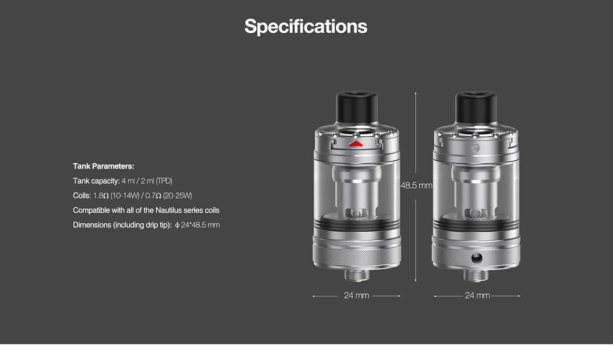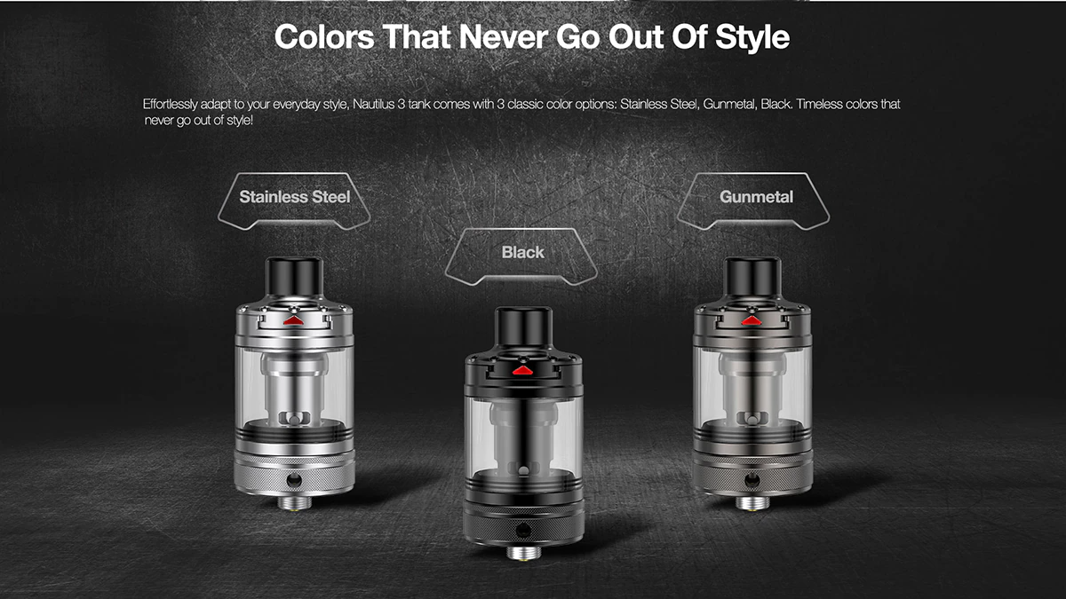 Ο πολυαναμενόμενος ατμοποιητής Nautilus 3 Tank ήρθε για να μας εντυπωσιάσει και να συνεχίσει την παράδοση της σειράς Nautilus. Είναι απόλυτα συμβατός με τις αντιστάσεις τις σειράς Nautilus με άφθονες επιλογές στην ωμικότιτά τους για να επιλέξουμε τι είδους άτμισμα μας ταιριάζει. Η καινοτομία στο σύστημα αλλαγής αντίστασης είναι κάτι που εντυπωσιάζει μιας και κάνει την αντικατάστασή της μια εξαιρετικά απλή διαδικασία εξασφαλίζοντας μηδενικές διαρροές. Αυτό επιτυγχάνετε με μια βαλβίδα διακοπής υγρού που αποτρέπει την είσοδο του υγρού στο θάλαμο της αντίστασης ενώ την αλλάζουμε. Ο Nautilus 3 Tank μας παρέχει πολλές επιλογές ροής αέρα, οι οποίες μπορούν να ρυθμιστούν μέσω 7 διαφορετικών ρυθμίσεων από το δαχτυλίδι στο κάτω μέρος του ατμοποιήτη. Η διάμετρος των οπών ροής αέρα είναι: 3,0 χιλιοστά, 2,5 χιλιοστά, 1,8 χιλιοστά, 1,5 χιλιοστά, 1,2 χιλιοστά, 1,0 χιλιοστά και 0,8 χιλιοστά που μας εξασφαλίζουν πλούσια γεύση αλλά και μια εξαιρετική MTL εμπειρία. Τέλος η αναπλήρωση του υγρού είναι απλούστατη, σύροντας στο πάνω μέρος το κάλυμμα και απλώς γεμίσουμε.