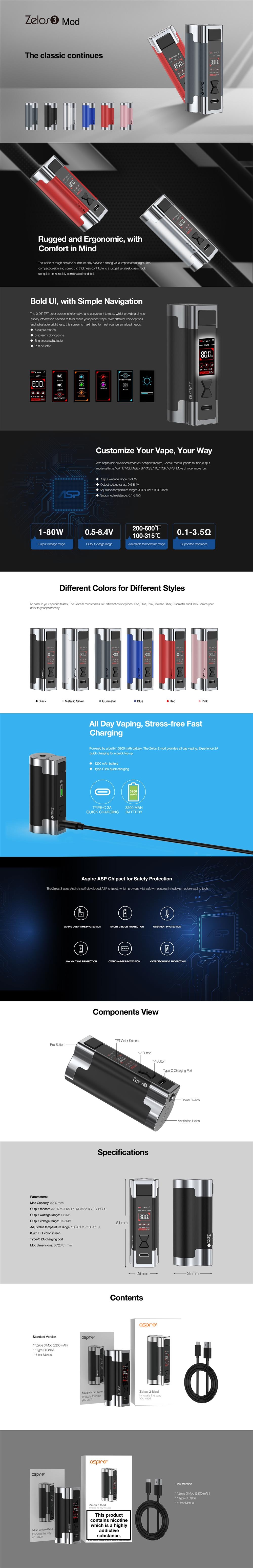 Η τελευταία επανάληψη της δημοφιλούς λειτουργίας Zelos box της Aspire είναι επιτέλους εδώ. Το Zelos 3 προσφέρει καλύτερη απόδοση διατηρώντας παράλληλα την εργονομία και τη φορητότητα. Κατασκευασμένο από ψευδάργυρο και κράμα αλουμινίου παρέχει ισχυρή οπτική επίδραση με την πρώτη ματιά. Ο συμπαγής σχεδιασμός και το κατάλληλο μέγεθος, συμβάλλουν σε μια στιβαρή αλλά κομψή κλασική εμφάνιση, παράλληλα με μια απίστευτα άνετη αίσθηση στο χέρι. Η έγχρωμη οθόνη TFT 0,96 ιντσών είναι κατατοπιστική και βολική για ανάγνωση, ενώ παρέχει όλες τις απαραίτητες πληροφορίες που απαιτούνται για να προσαρμόσετε το τέλειο άτμισμα. Με διαφορετικές επιλογές χρώματος και ρυθμιζόμενη φωτεινότητα, αυτή η οθόνη μεγιστοποιείται για να καλύψει τις εξατομικευμένες ανάγκες σας. Τροφοδοτείται από μια ενσωματωμένη μπαταρία 3200mah , διαθέτει γρήγορη φόρτιση Type C ενώ η μέγιστη ισχύς εξόδου του φτάνει τα 80W. Τέλος το smart ASP chipset σύστημα μας παρέχει μια συνεπή και ισχυρή απόδοση puff after puff.