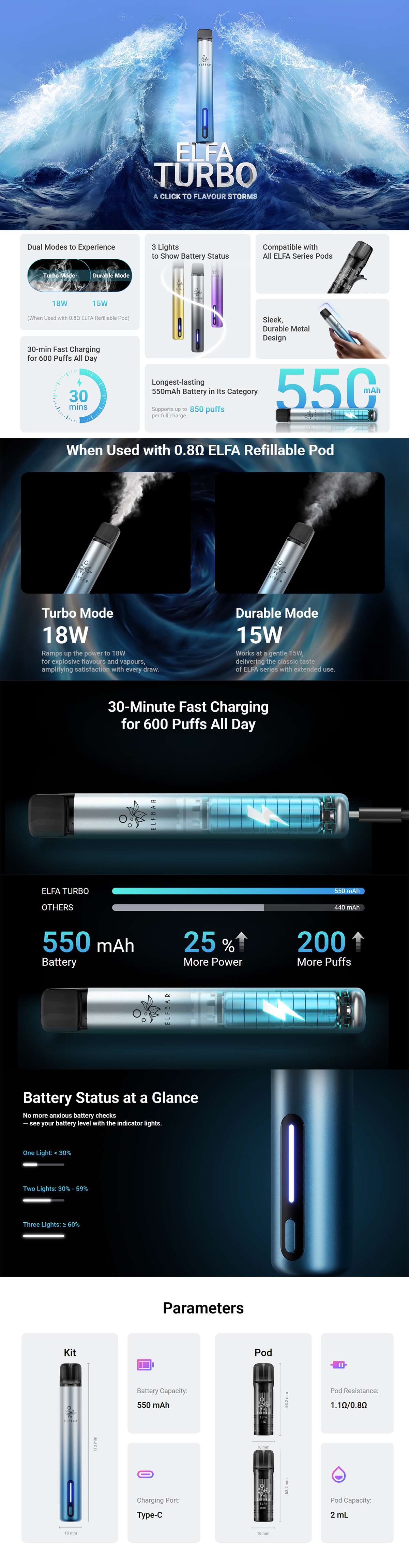 Το Kit είναι συμβατό με όλα τα pods της σειράς ELFA (χωρητικότητας 2ml), προσφέροντας ευελιξία στη χρήση είτε με προγεμισμένες κάψουλες είτε με επαναγεμιζόμενες (δεν περιλαμβάνονται όλα στη βασική συσκευασία). Κατασκευασμένο από ανθεκτικά υλικά PC και ABS με μεταλλικό φινίρισμα, το ELFA Turbo Kit είναι σχεδιασμένο για να αντέχει στην καθημερινή χρήση, ενώ οι ενδείξεις LED σας ενημερώνουν διακριτικά για τη στάθμη της μπαταρίας.