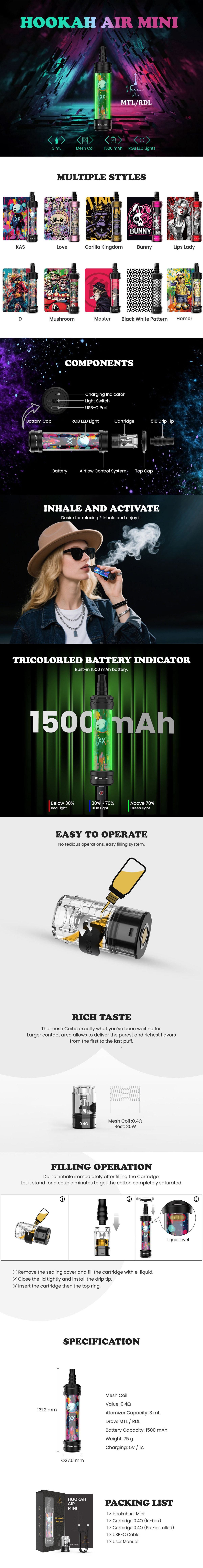 Το Fumytech Hookah Air Mini Kit είναι μια μικρή και φορητή ηλεκτρονική συσκευή τύπου e-shisha, σχεδιασμένη ώστε να θυμίζει ναργιλέ τόσο σε εμφάνιση όσο και σε αίσθηση χρήσης. Διαθέτει ενσωματωμένη μπαταρία 1500mAh, η οποία προσφέρει μια πολύ καλή αυτονομία για καθημερινή χρήση, ενώ η απόδοση ρυθμίζεται αυτόματα μέχρι περίπου τα 30W, χωρίς να απαιτούνται ρυθμίσεις από τον χρήστη. Το δοχείο υγρού (pod) έχει χωρητικότητα 3ml και χρησιμοποιεί ενσωματωμένη mesh αντίσταση 0.4Ω, η οποία είναι ιδανική για πιο ζεστό και πλούσιο ατμό. Η συσκευή ενεργοποιείται με την εισπνοή, χωρίς κουμπί κάτι που την κάνει πολύ απλή και εύχρηστη. Το Hookah Air Mini διαθέτει ρυθμιζόμενο airflow, που επιτρέπει στον χρήστη να προσαρμόσει τη ροή του αέρα από πιο σφικτή  τύπου MTL έως πιο ανοιχτή τύπου RDL. Διαθέτει επίσης LED φωτισμό με εφέ, ο οποίος δίνει μια πιο παιχνιδιάρικη εμφάνιση στη συσκευή, αλλά μπορεί να απενεργοποιηθεί αν δεν επιθυμείτε. Το βάρος του είναι περίπου 75 γραμμάρια, γεγονός που το κάνει πολύ ελαφρύ και άνετο στη μεταφορά.