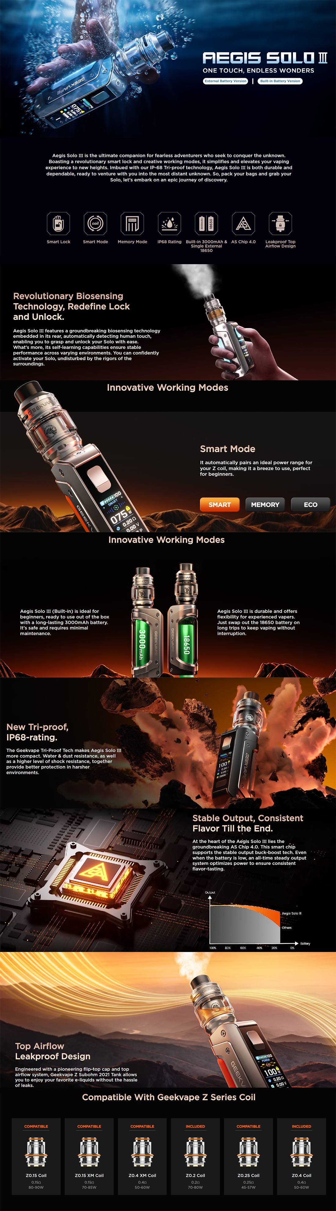 Ανακαλύψτε το νέο Geek Vape Aegis Solo 3, την απόλυτη συσκευή mod που συνδυάζει στιβαρή κατασκευή, κορυφαίες επιδόσεις και καινοτόμα χαρακτηριστικά για τους πιο απαιτητικούς ατμιστές. Το Aegis Solo 3 είναι σχεδιασμένο να προσφέρει εξαιρετική εμπειρία ατμίσματος με αυξημένη ανθεκτικότητα και εργονομία, κάνοντάς το ιδανική επιλογή για καθημερινή χρήση . Τροφοδοτείται από μια αποσπώμενη μπαταρία τύπου 18650 (δεν περιλαμβάνεται) , η φόρτισή του επιτυγχάνετε μέσο της θύρας USB-C για γρήγορη και ασφαλή φόρτιση( συνιστάτε η φόρτιση να γίνατε σε εξωτερικό ειδικό φορτιστή μπαταριών) ενώ η μέγιστη ισχύς του φτάνει στα 100W προσφέροντας μας πλούσιο ατμό και υπεροχή γεύση Είναι εξοπλισμένο με το AS 3.0 chipset που προσφέρει γρήγορη απόκριση και εξαιρετική σταθερότητα, εξασφαλίζοντας απρόσκοπτη απόδοση σε κάθε ατμιστική εμπειρία καθώς επίσης υποστηρίζει πολλαπλές λειτουργίες όπως Power Mode, Bypass Mode και TC Mode για να προσαρμόσετε το άτμισμα ακριβώς όπως το θέλετε. Διαθέτει πιστοποίηση IP68, που καθιστά το Solo 3 αδιάβροχο, ανθεκτικό στη σκόνη και στις πτώσεις, κάνοντάς το ιδανικό για εξωτερικές δραστηριότητες και απαιτητικές συνθήκες. Τέλος η έγχρωμη οθόνη TFT 1.08” σας επιτρέπει να δείτε με ακρίβεια όλες τις βασικές πληροφορίες, όπως επίπεδο μπαταρίας, ρυθμίσεις ισχύος και τύπο λειτουργίας. Το Geek Vape Aegis Solo 3 είναι η ιδανική επιλογή για όσους αναζητούν δύναμη, ανθεκτικότητα και αξιοπιστία σε μία συσκευή. Απολαύστε την τεχνολογία αιχμής και τη γνωστή ποιότητα της Geek Vape, με την πιο στιβαρή και εξελιγμένη συσκευή της σειράς Aegis.
