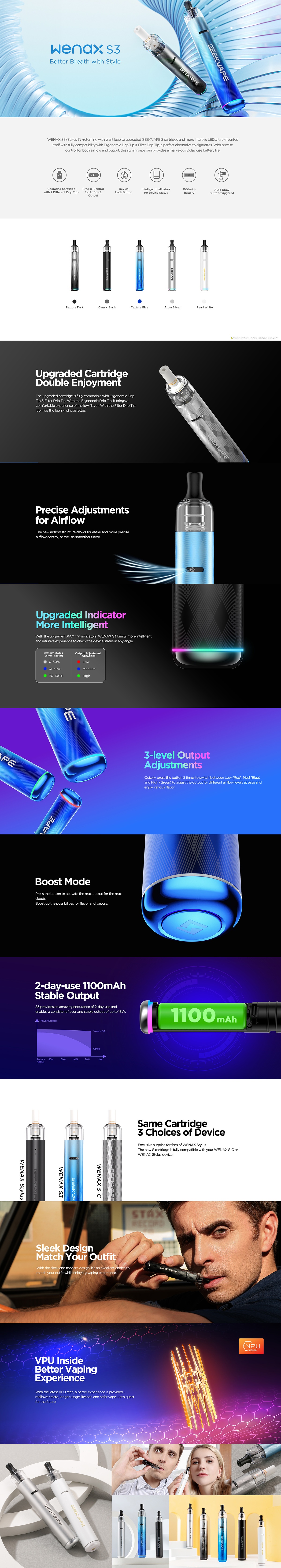 GeekVape αναπτύσσει την γκάμα της στην σειράς Wenax και μας παρουσιάζει το νέο Wenax S3 ! Το Wenax S3 είναι εξοπλισμένο με μια ενσωματωμένη μπαταριά των 1100mAh που μας προσφέρει διάρκεια χρήσης έως 2 ημέρες με σταθερή γεύση καθώς και σταθερή απόδοση έως 18W ενώ η φόρτισή του επιτυγχάνετε μέσο της θήρας USB Type-C που διαθέτει . To βελτιωμένο Pod της GeekVape S Pod Cartridge με τεχνολογία VPU μας παρέχει καλύτερη εμπειρία ατμίσματος , πιο απαλή γεύση ,μεγαλύτερη διάρκεια ζωής της αντίστασης και ασφαλέστερο άτμισμα. To S Pod μπορεί να χρησιμοποιηθεί είτε με το εργονομικό επιστόμιο είτε με το ειδικά σχεδιασμένο φίλτρο της GeekVape ενώ είναι πλήρως συμβατό με τις συσκευές WENAX S-C ή WENAX Stylus. Το Wenax S3 διαθέτει νέο σύστημα ροής αέρα(airflow) που μας διασφαλίζει ευκολότερο και ακριβέστερο έλεγχο ροής αέρα, καθώς και πιο απαλή γεύση. Το WENAX S3 προσφέρει πιο έξυπνη και διαισθητική εμπειρία για τον έλεγχο της κατάστασης της συσκευής από οποιαδήποτε γωνία με τους αναβαθμισμένους δείκτες LED 360°.Πατώντας γρήγορα το κουμπί 3 φορές επιτυγχάνουμε μια εναλλαγή μεταξύ Χαμηλό (Κόκκινο), Μεσαίο (Μπλε) και Υψηλό (Πράσινο) για να προσαρμόσουμε εύκολα την ένταση της ισχύς για διαφορετικά επίπεδα ροής αέρα και να απολαύσουμε διάφορες γεύσεις. Τέλος πατώντας το κουμπί για να ενεργοποιήσουμε τη μέγιστη απόδοση ,διευρύνουμε τις δυνατότητες για περισσότερη γεύση και ατμό.