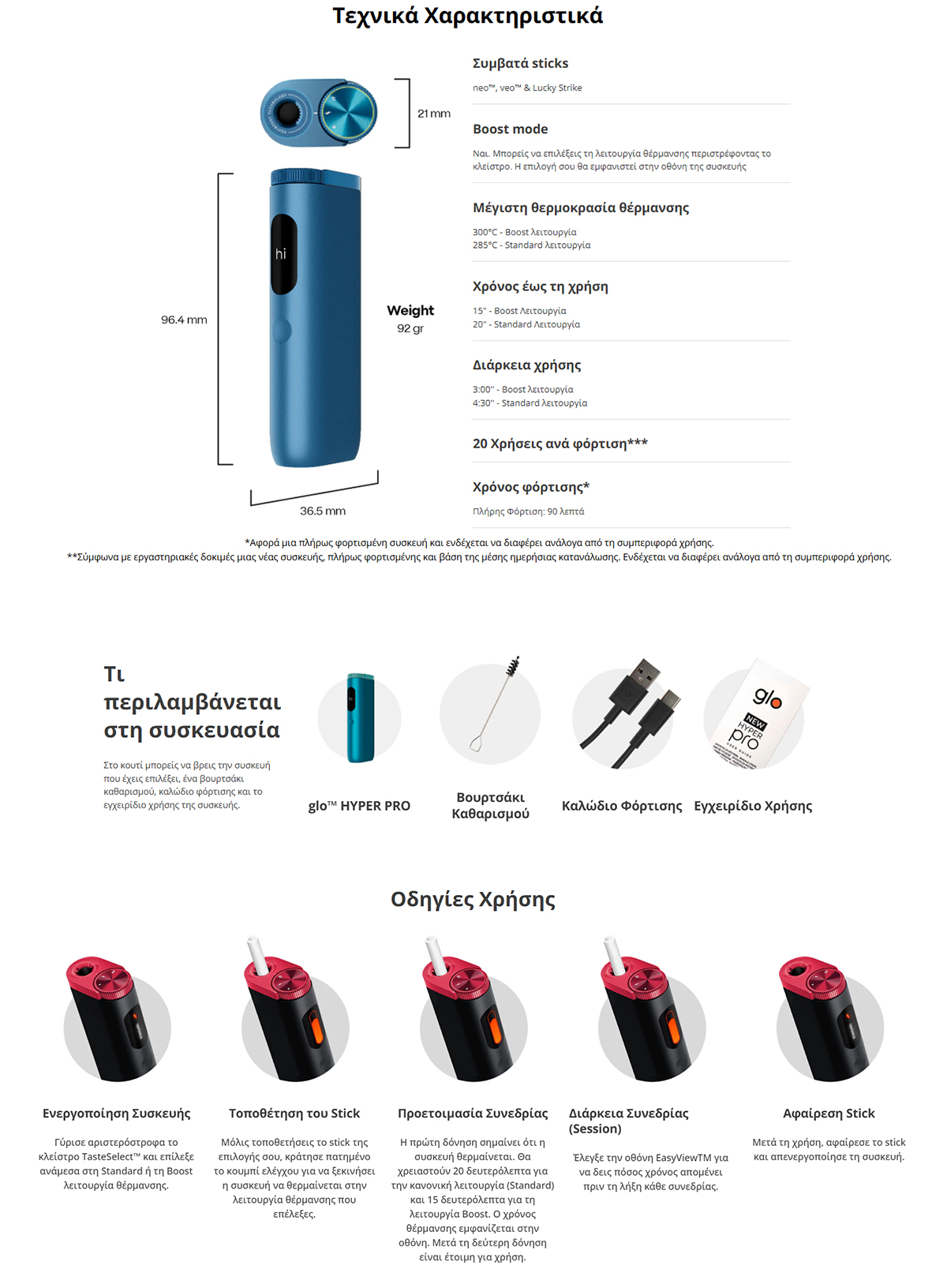To νέο Glo Hyper Pro διαθέτει τεχνολογία HeatBoost™ για καλύτερη γευστική εμπειρία από την πρώτη στιγμή και έχει εξοπλιστεί με κλείστρο TasteSelect™ για πιο γρήγορη επιλογή λειτουργίας θέρμανσης (Standard ή Boost). Η μπαταρία του με πλήρη φόρτιση διαρκεί για 20 συνεδρίες όπου η κάθε συνεδρία σε κανονική λειτουργία (Standard) διαρκεί περισσότερο από 4,5 λεπτά ενώ μια πλήρης φόρτιση επιτυγχάνετε σε 90 λεπτά περίπου. Τέλος έχει γίνει προσθήκη οθόνης για να βλέπεις ανά πάσα στιγμή το επίπεδο μπαταρίας, το χρόνο φόρτισης, το χρόνο που απομένει για κάθε συνεδρία και την επιλεγμένη λειτουργία θέρμανσης.