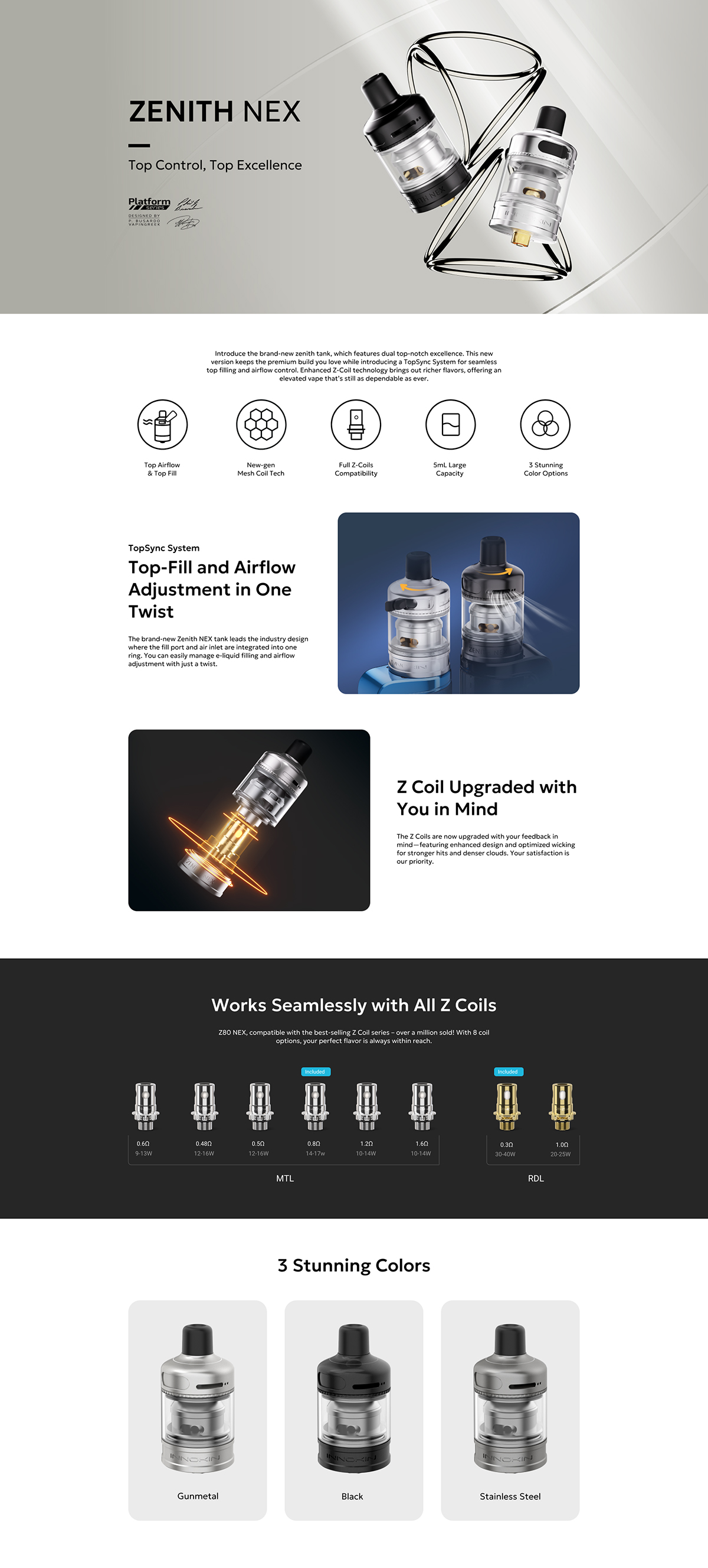 Η Innokin μας παρουσιάζει τον νέο της ατμοποιητή τον Zenith Nex 5ml. Ο Zenith Nex Tank της Innokin είναι ένας ατμοποιητής νέας γενιάς που ενσωματώνει την υψηλή ποιότητα κατασκευής της σειράς Zenith, προσφέροντας εξαιρετική απόδοση ατμίσματος και πρακτικότητα μέσω του συστήματος TopSync ένα σύστημα που μας βοηθάει από την απρόσκοπτη πλήρωση και τον έλεγχο ροής του αέρα. Η βελτιωμένη τεχνολογία Z Coil αναδεικνύει πιο πλούσια γεύση, προσφέροντας μία καλύτερη εμπειρία ατμίσματος. Ο Zenith Nex Tank είναι ιδανικός για όσους αναζητούν ποιότητα και λειτουργικότητα στην ατμιστική τους εμπειρία.