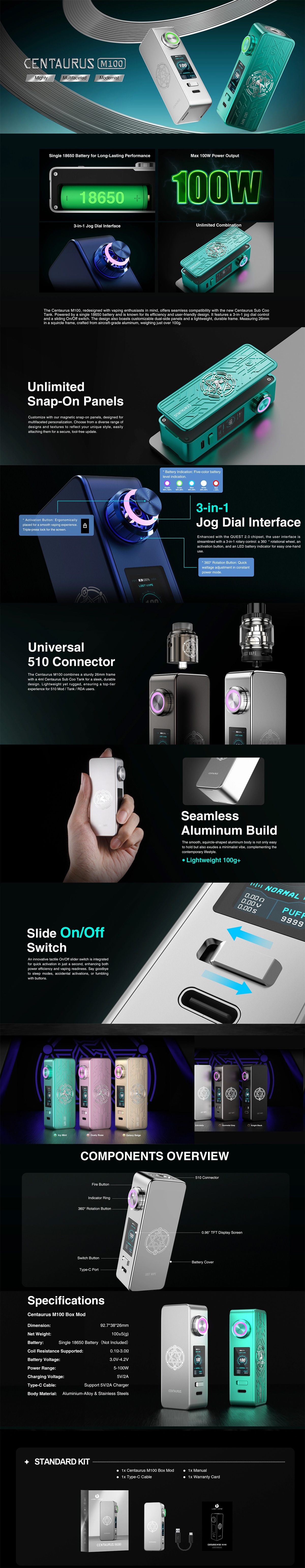 Καλώς ήρθατε στον κόσμο της απόλυτης εμπειρίας ατμίσματος με το Centaurus M100 Mod από την Lost Vape! Αυτή η εκπληκτική σειρά επιστρέφει με το εντυπωσιακό Mod Centaurus M100, ένα υπέροχα σχεδιασμένο Mod που θα σας εντυπωσιάσει με την απόδοσή του. Το Mod Centaurus M100 τροφοδοτείτε από μία εξωτερική μπαταρία τύπου 18650 (δεν περιλαμβάνεται), ενώ η γρήγορη φόρτιση μέσω της θύρας USB Type-C εξασφαλίζει επίσης ότι δεν θα χάσετε καμία στιγμή ατμίσματος (συνίσταται η φόρτιση των μπαταριών να γίνετε σε εξωτερικό ειδικό φορτιστή μπαταριών). Ο εκπληκτικός μηχανισμός ρύθμισης ισχύος που διαθέτει, με έναν εργονομικά σχεδιασμένο τροχό στο διακόπτη, σας επιτρέπει να προσαρμόσετε την ισχύ του έως και 100 watts, εξασφαλίζοντας μια προσαρμοσμένη εμπειρία ανάλογα με τις προτιμήσεις σας. Τέλος το Mod Centaurus M100 διακρίνεται για τις υπέροχες χαράξεις που το διακοσμούν, προσδίδοντας ένα μοναδικό στυλ που ξεχωρίζει. Με διαστάσεις 92.7x38x26mm, αυτό το μοναδικό Mod προσφέρει άνεση στο χέρι.