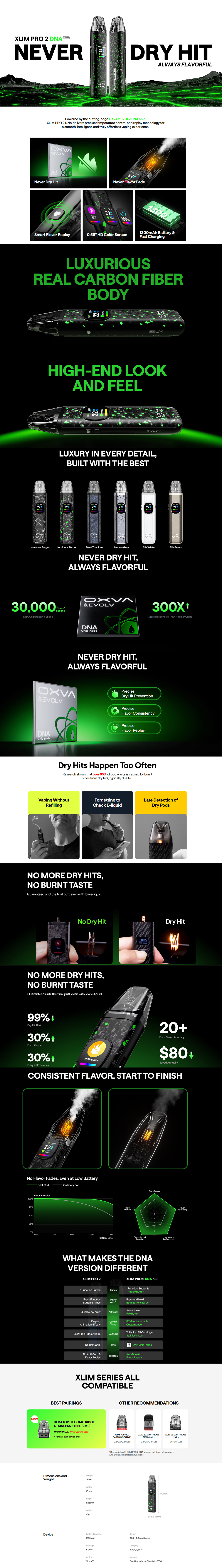 Το OXVA Xlim Pro 2 DNA είναι ένα premium Pod τόσο σε σχεδιασμό όσο και στην έξυπνη τεχνολογία (DNA chip) σε ένα εργονομικό compact μέγεθος. Είναι εξοπλισμένο με μια ενσωματωμένη μπαταρία των 1300mAh , έχει εύρος ισχύος από 5 έως 30W που το καθιστά κατάλληλο τόσο για MTL εισπνοές όσο και για RDL ενώ η φόρτισή του επιτυγχάνετε μέσο της θύρας USB Type-C με 5V/2A για γρήγορη και ασφαλή επαναφόρτιση. Η έγχρωμη οθόνη των 0.56″ HD που είναι εξοπλισμένο, μας παρέχει άμεσα όλη την απαραίτητη πληροφόρηση για το Pod μας. Η κατασκευή του από Zinc Alloy + Carbon Fiber / IML + PCTG μας προσδίδει μια premium αίσθηση και αντοχή. Τέλος τα pod χωρητικότητας 2ml (Top-Fill) μας προσφέρουν μια υπέροχη γεύση , ικανοποιητική παραγωγή ατμού και ευκολία αναπλήρωσης υγρού ενώ η πλευρική (AFC) ρυθμιζόμενη ροή αέρα (Airfow) μας προσφέρει ένα εξατομικευμένο τράβηγμα. Το OXVA Xlim Pro 2 DNA είναι ιδανικό για όσους θέλουν καθαρή γεύση, αξιόπιστη αυτονομία και πλήρη έλεγχο της εμπειρίας ατμίσματος