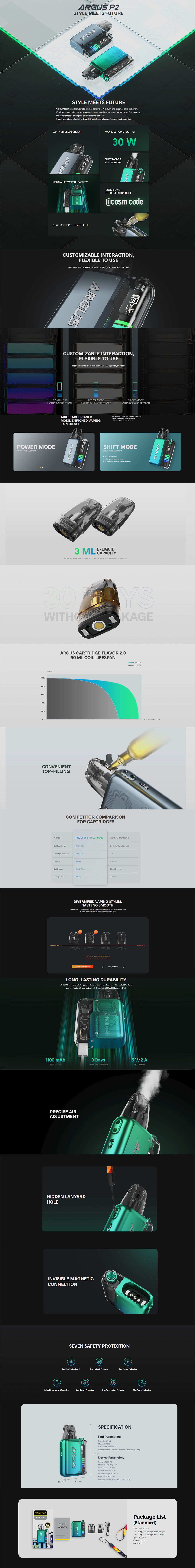 Το VooPoo Argus P2, είναι μια εξαιρετική επιλογή για τους λάτρεις του ατμίσματος, που αναζητούν υψηλή απόδοση και εξαιρετική γεύση. Είναι εξοπλισμένο με μια ενσωματωμένη μπαταριά των 1100mAh ενώ με χωρητικότητα δεξαμενής 2ml, μας επιτρέπει να απολαμβάνουμε ποικιλία αρωμάτων για μεγάλο χρονικό διάστημα. Ενσωματώνοντας την προηγμένη τεχνολογία GENE.TT μας προσφέρει γρήγορη ανάφλεξη και ακρίβεια στον έλεγχο της θερμοκρασίας. Αυτό εξασφαλίζει μια ομαλή και απρόσκοπτη ατμιστική εμπειρία κάθε φορά. Διαθέτει οθόνη OLED που παρέχει καθαρή εμφάνιση των ρυθμίσεων και των πληροφοριών της συσκευής. Επιπλέον, ενσωματώνει ποικίλες λειτουργίες προστασίας για να εξασφαλίσει την ασφαλή χρήση κάθε φορά. Τέλος το Argus P2 έχει εργονομικό σχεδιασμό και εξασφαλίζει άνετη χρήση, ενώ ταυτόχρονα προσφέρει εντυπωσιακή αισθητική ενώ η κατασκευή του είναι από ανθεκτικό υλικό, εξασφαλίζοντας μακροχρόνια αξιοπιστία και αντοχή.