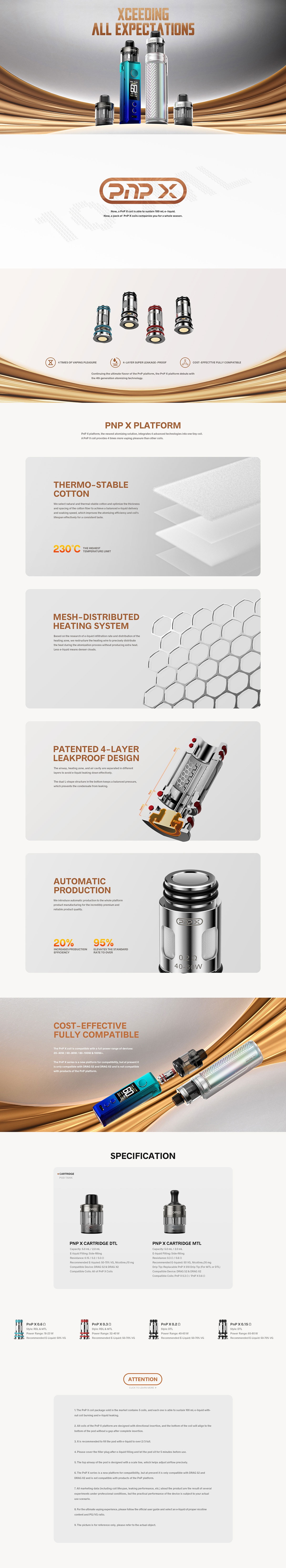 Το PnP X Pod Tank υιοθετεί την νέα σειρά αντιστάσεων της VooPoo PnP X Coil Tech και μας προσφέρει εξαιρετική γεύση και παραγωγή ατμού μιας και μας δίνει την επιλογή με τις δυο διαθέσιμες εκδόσεις τόσο για DTL όσο και για MTL ατομιστικής εμπειρίας Διαθέτει κορυφαία εισαγωγή ροής αέρα και σύστημα πλευρικής πλήρωσης ενώ η χωρητικότητα υγρού αναπλήρωσης ανέρχεται στα 5ml. Ο PnP X Pod Tank είναι συμβατός με την ευρέως αναγνωρισμένη σειρά PnP Coils της Voopoo, επιτρέποντάς σας να επιλέγετε το επίπεδο αντίστασης που σας ταιριάζει καλύτερα. Τέλος ο εργονομικός σχεδιασμός και ο απλός τρόπος αναπλήρωσης καθιστούν τον PnP X Pod Tank φιλικό προς τον χρήστη και ιδανικό για αρχάριους και έμπειρους ατμιστές.